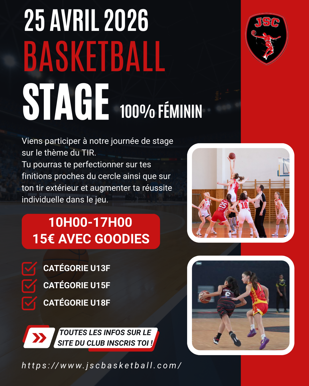 Le Club de la JSC organise son dernier stage de la saison le samedi 25 avril 2026 de 10h00 à 17h00, pour les jeunes de notre filière féminine. Il est ouvert à l’externe et payant « 15€ avec goodies ».